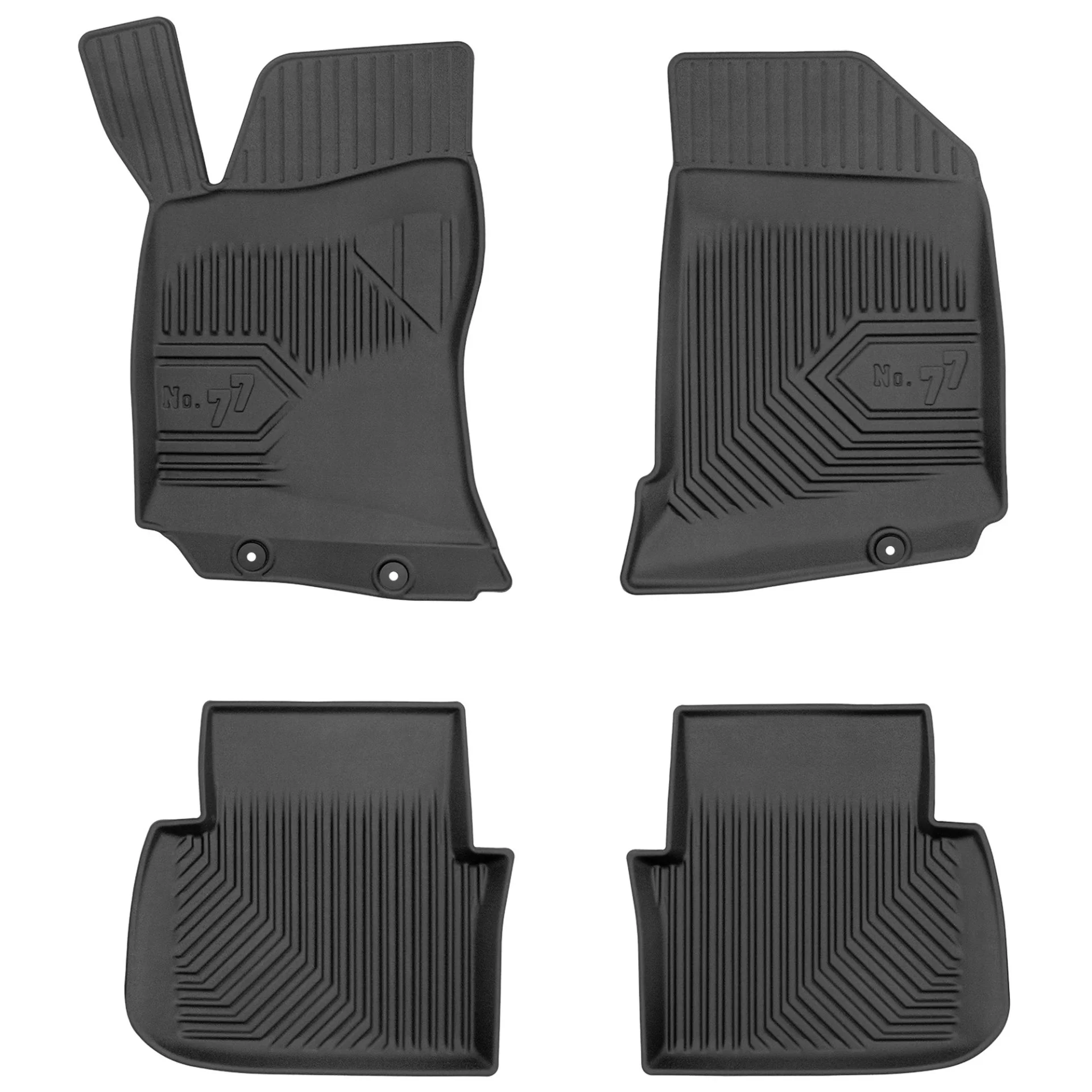 Stabilność i bezpieczeństwo – wyposażenie dywaników samochodowych No. 77 w komplet stoperów dopasowanych do oryginalnych miejsc montażowych w Twoim aucie zapewni najwyższy poziom stabilności nawet podczas ostrego hamowania. Ponadto dywaniki wykonane są z ekologicznych i pozbawionych nieprzyjemnych zapachów materiałów, które są bardzo łatwe w utrzymaniu czystości.